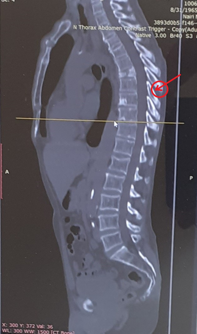 55 տարեկան տղամարդն Ուռուցքաբանության ազգային կենտրոն է ընդունվել կրծքային 7-րդ ողի ախտաբանական, այսինքն վնասվածքին ոչ բնորոշ մեխանիզմով ստացված կոտրվածքով, որն առաջացել էր ընդամենը 50կգ ծանրությամբ բեռ բարձրացնելու արդյունքում։ Ինչից ելնելով բժիշկները կասկածել են, որ կա ողերի մետաստատիկ ախտահարում։